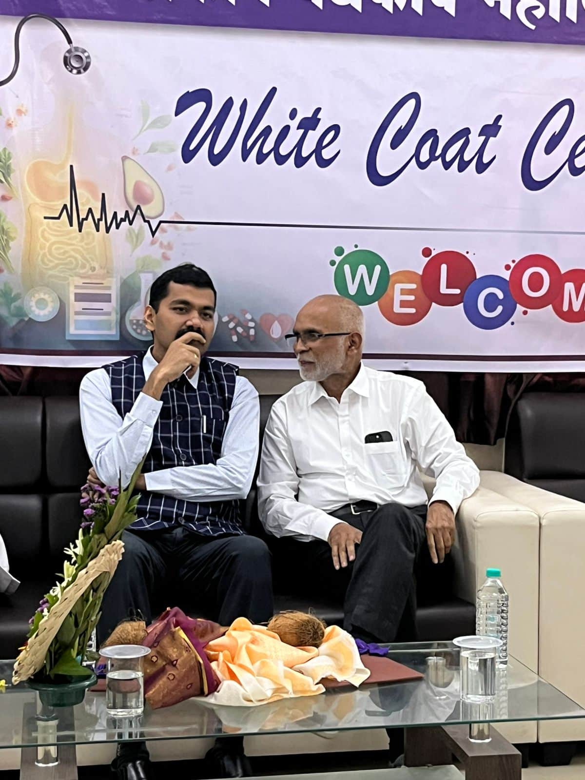 The white‑coating itself, as the students filed onto the stage wearing crisp white lab coats under bright stage lights, created a vivid tableau of hope and responsibility. Dr Deopujari personally helped some students don their coats, symbolising the transition from student to professional. Shri Kumbhejkar presented the official memento of the ceremony, reinforcing the institution’s promise to serve not just the region but the nation.