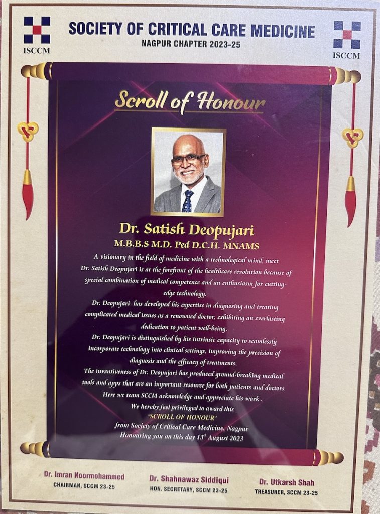 It was a proud and prestigious honour for Dr Satish Deopujari to be bestwoed upon the Lifetime Achievement Award by Indian Society of Critical Care Medicine (ISCCM), Nagpur.