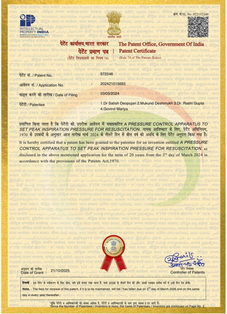 About the patent received recently by our group. Presently we measure pressure with ventilators far away from the point where it really matters. Measuo pressure in the airways near the carina would be reflecting the pressure dynamics differently and hence this project was undertaken.